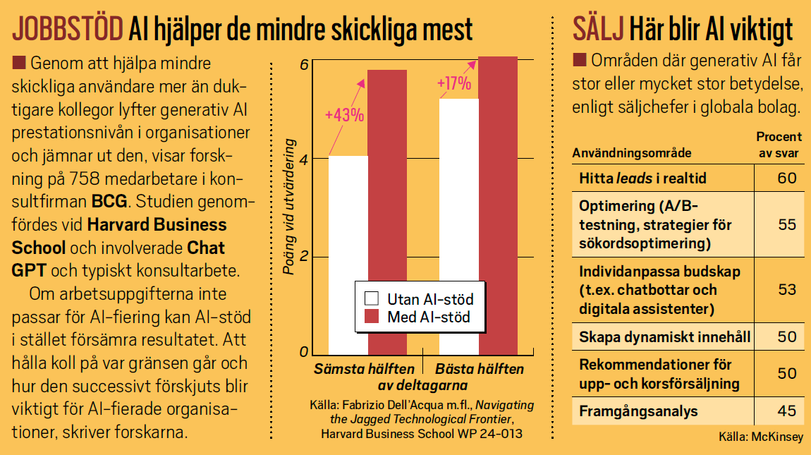 – Generativ AI är verkligt goda nyheter för dem. Till skillnad från tidigare teknologiska paradigm kräver det mycket mindre specialiserad kompetens – standardlösningar räcker för mindre företag. AI kan gynna mindre, lättrörliga bolag oproportionellt mycket, inte minst småföretag med hög teknologikunskap.