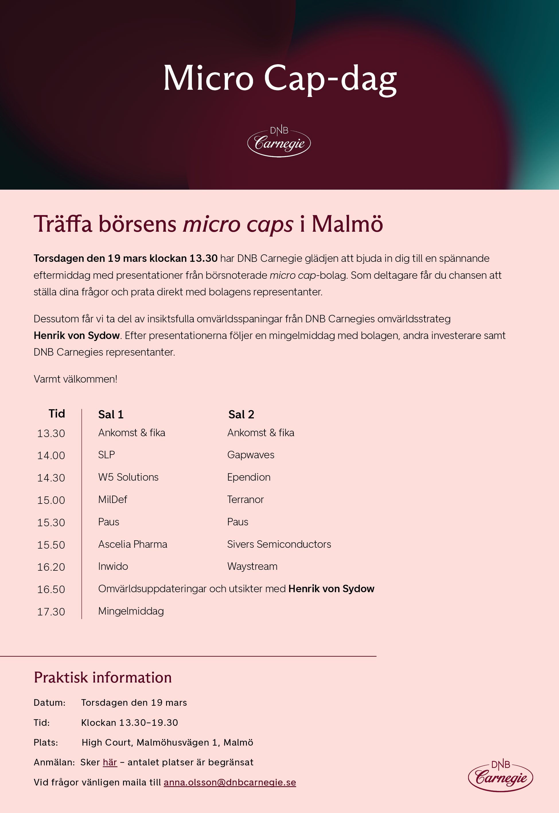 Hej, eventet är tyvärr fullt. Vänligen mejla anna.olsson@dnbcarnegie.se för väntelista.