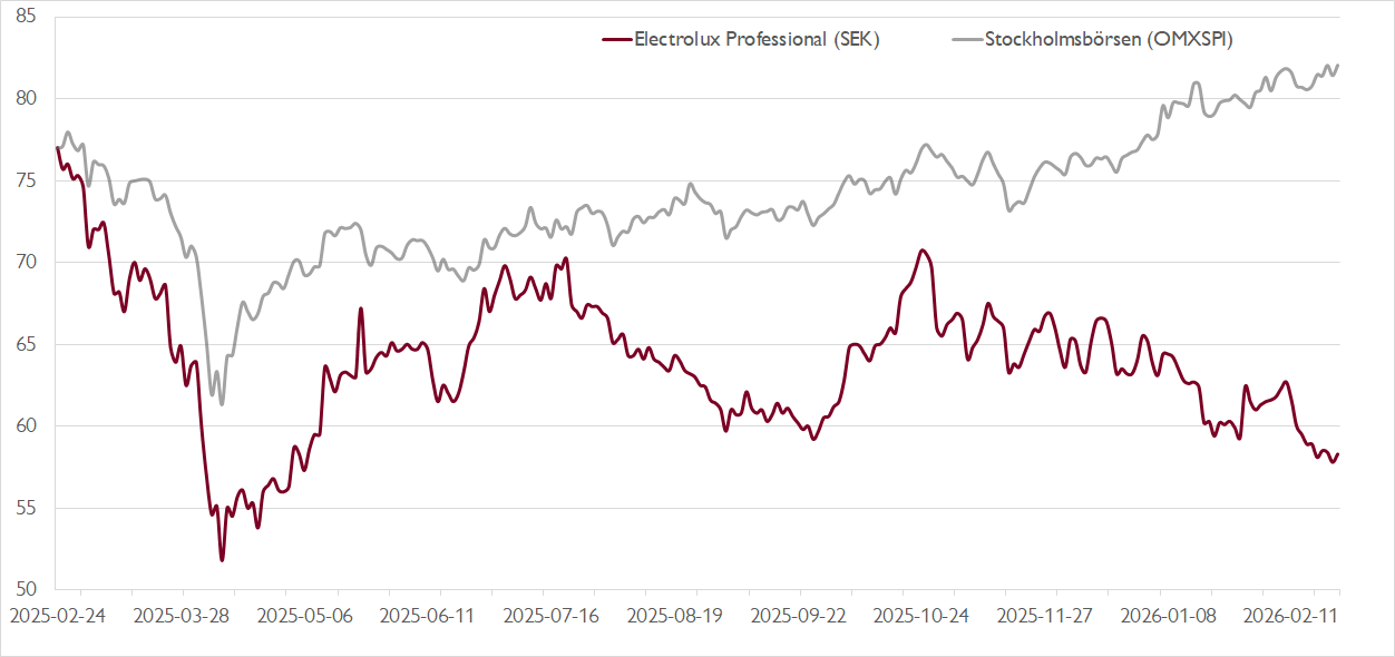 Lockar med Electrolux Professional gör bolagets starka marknadsposition och en tillväxt som drivs av såväl strukturella trender som självfinansierade förvärv. Bolagets starka fria kassaflöden, vi räknar med över 1,3 miljarder årligen 2026–2028, ger utrymme för förvärv, ökad utdelning och/eller återköp av aktier. Efter att aktien backat med nära 25 procent senaste året ger kassaflödet också värderingsstöd via en fri kassaflödes-yield på attraktiva cirka 8 procent.
