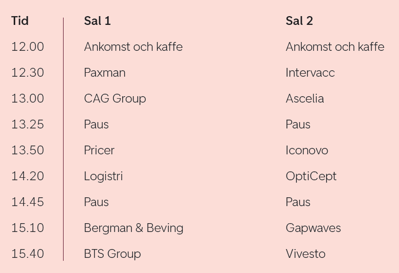 personligen träffa representanter från bolagen. Under eftermiddagens pauser finns tid att mingla med bolagsrepresentanterna samt andra investerare.