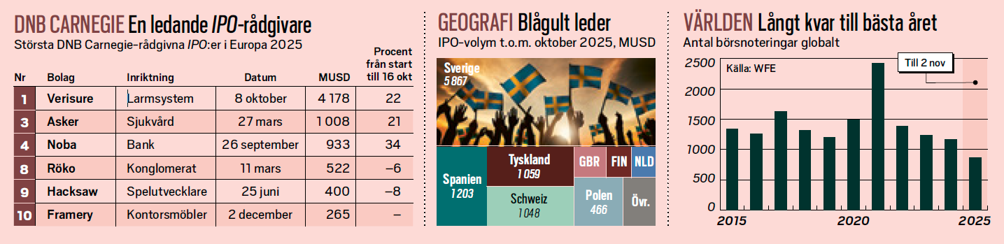 På Europas hetaste IPO-marknad sticker samtidigt DNB Carnegie ut med en överlägsen ledarposition, kanske bäst illustrerat av att banken varit med som rådgivare vid samtliga av de 35 största börsnoteringarna i Norden 2020– 2025, samt rådgivit flest affärer i Europa under samma tidsperiod.