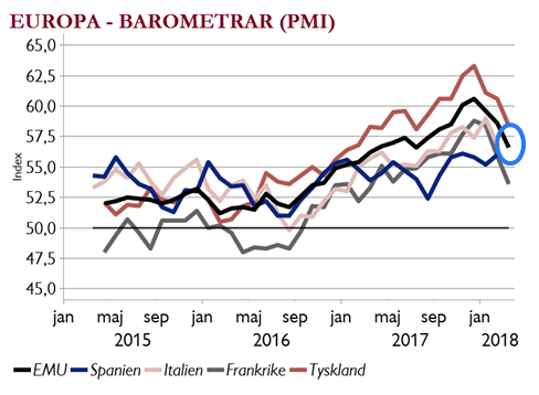 - Tyska IFO-barometern visade ett optimistiskt nuläge, men lite sämre framtidsförhoppningar. PMI-indexen i Europa föll återigen. En lägre expansionstakt oroar något – men kan kanske förklaras av tulloro och stark euro.