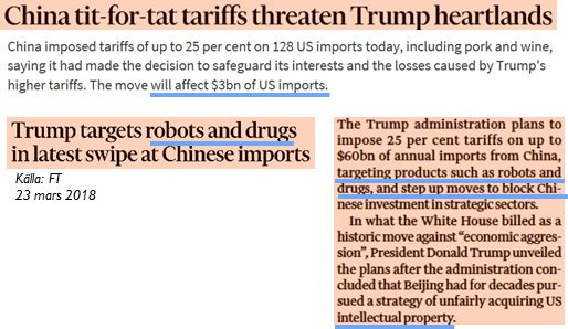 - I fokus nu är Trumps mer omfattande planer på teknologitullar och investeringsbegränsningar för att motverka ”orättvisorna” inom immateriella rättigheter. Här har det talats om kinesisk export för 50-60 mdr USD.