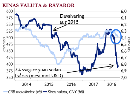 Handelskriget mellan USA och Kina har dock en eskalerande ton från båda sidor. Aktier globalt har klarat sig bra och dollarn blivit en säker hamn – men Kinas börs, valuta och råvaror har pressats.
