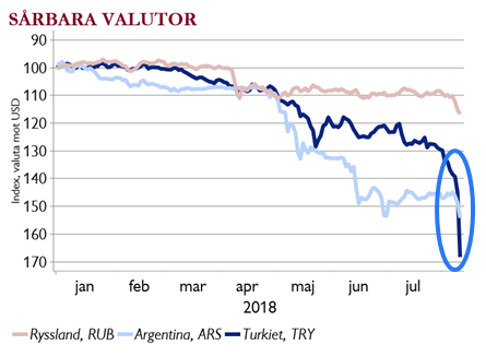 - Turkiet är en liten ekonomi med låg statsskuld men nu har valutan rasat – hela 21 procent på en vecka mot USD – och andra tillväxtmarknader har smittats. En stark dollar och högre USA-räntor skapar problem för flera valutor.