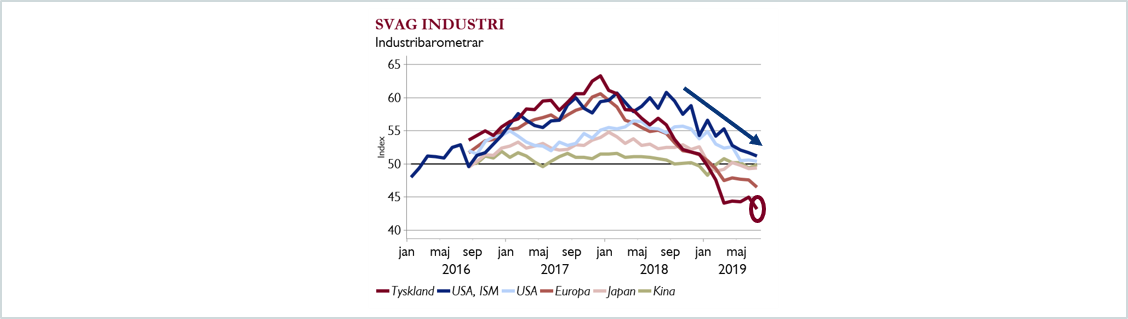 Industripessimismen förvärras stadigt. Särskilt ser vi svag data från exportberoende länder som Tyskland, Sydkorea och Sverige. Tyska Ifo-barometern beskrivs vara i ”fritt fall” och Caterpillar i USA, som är globala och ses som en temperaturmätare inom verkstad, var mycket försiktiga i sin rapport.