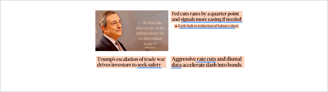 Obligationsräntor rasar: USA’s 10-åring under 1,75 procent, hela tyska statsskulden på negativ ränta – och fler duvaktiga centralbanker. Fed sänkte 25bp i slutet av juli (60bp till förväntas i år) och ECB signalerar stimulanser i september. Förra veckan såg vi Indien, Nya Zealand och Thailand sänka styrräntorna mer än väntat.