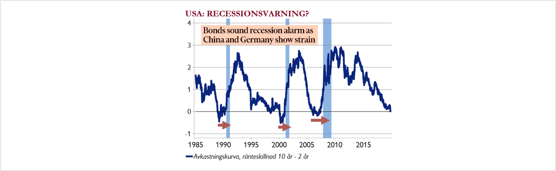 Oroliga börser förra veckan efter svaga signaler i Kina och Tyskland, samt en negativ räntekurva i USA (se graf, recessioner i blått). Notera dock att före recessioner har Fed ofta höjt räntan och räntenivån varit klart högre än nu. Recessionen har ofta dröjt 1-2 år och räntekurvan har ibland signalerat falskt.