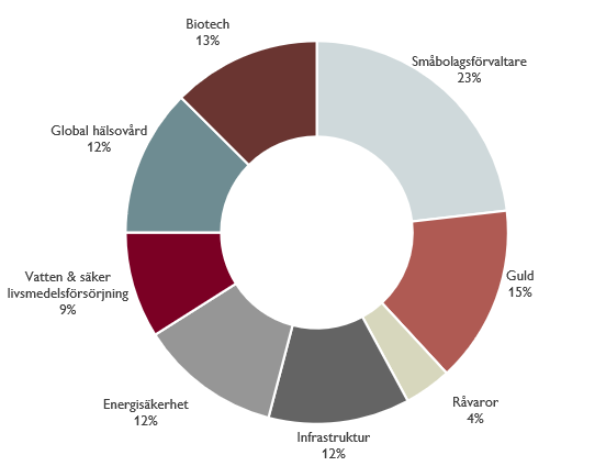 När vi nu adderar råvaror som en del av temat tar vi samtidigt hem lite vinst i guldgruvbolag som är upp närmare 90 procent i år. Vi säljer också en del av exponeringen mot jordbruksrelaterade bolag för att finansiera köpet. Portföljen har nu 19 procents exponering mot makrotemat fördelat på 4 procent råvaruindex, 4 procent eurohedgat guld, 6 procent guldgruvbolag och 5 procent silver.