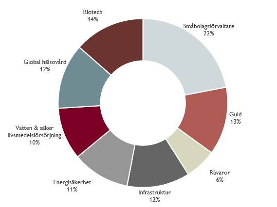 De underliggande drivkrafterna för guld är intakta och vi ser fortsatt en ”bull-marknad” även för silver och guldgruvbolag, men risken har ökat efter den kraftiga uppgången. Därför har vi valt att minska exponeringen mot guld, silver och guldgruvbolag till totalt cirka 13 procent, jämfört med som högst 20 procent i september. Portföljvikten för EUR-hedgat guld är nu drygt 6 procent, för guldgruvbolag 4 procent och för silver knappt 3 procent.