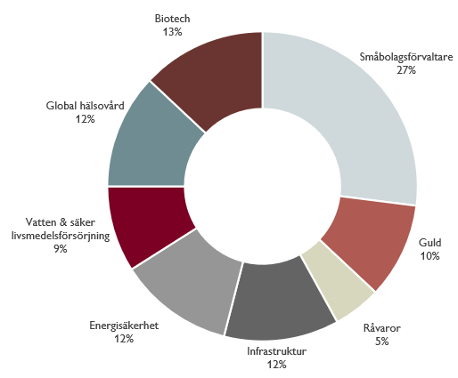 Inom det här temat har vi också valt att öka allokeringen mot europeiska småbolag som är lågt värderade och kan gynnas av ökade finanspolitiska stimulanser och bättre utsikter för konsumenterna under 2026. För att finansiera investeringen har vi tagit hem lite vinst inom biotech som också utvecklats starkt under hösten. Här handlar det dock mer om en rebalansering. Biotech är fortsatt portföljens största innehav där vi precis som för hela hälsovårdstemat ser stor potential framöver.