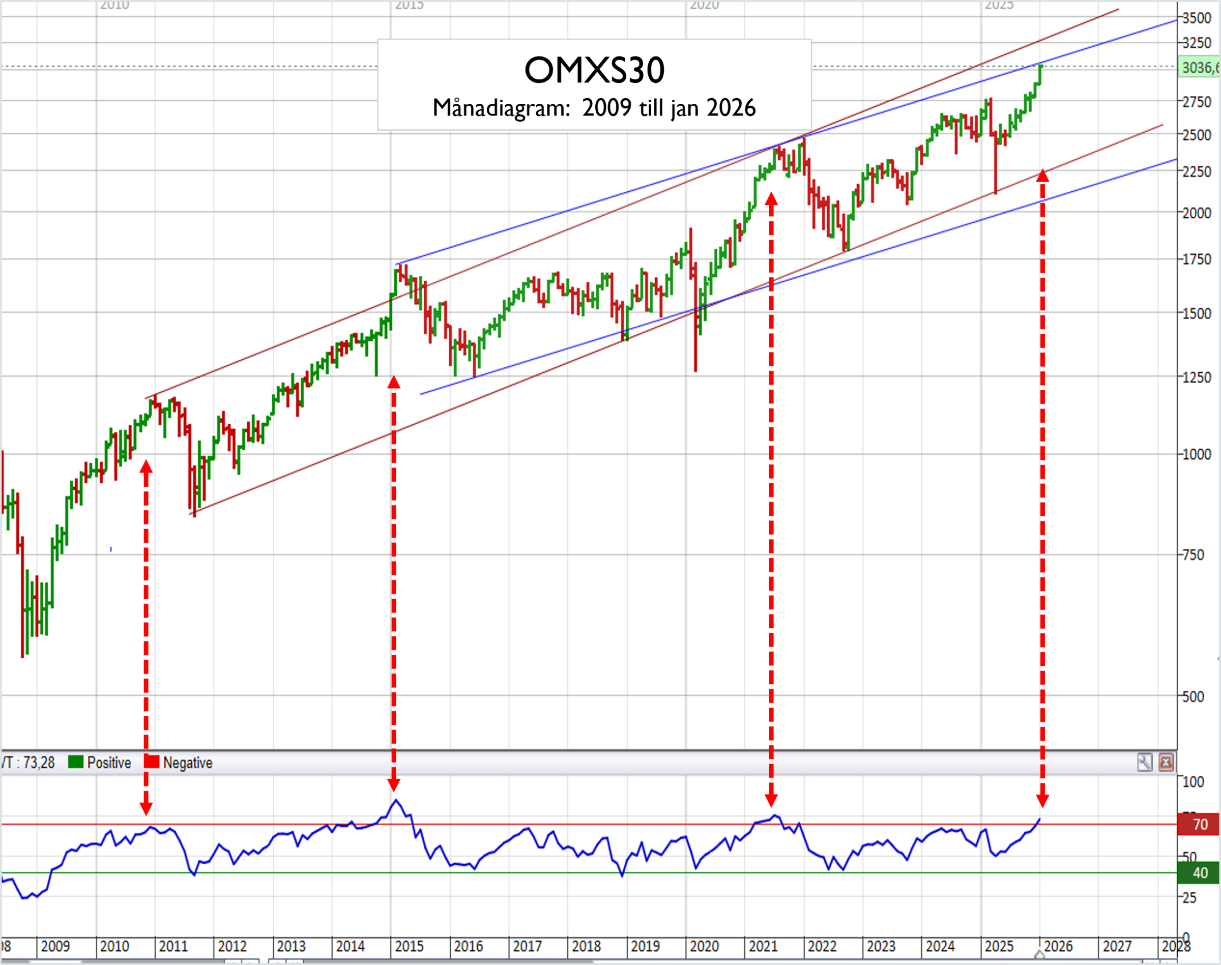 Som månadsdiagrammet nedan illustrerar noteras OMXS30-indexet nu vid ett motståndsområde som möter vid dryga 3 000 (blå trendkanal). Passeras den nivån möter nästa tekniska tak i den långsiktigt stigande trendkanalen (brun) vid runt 3 300 till 3 400.