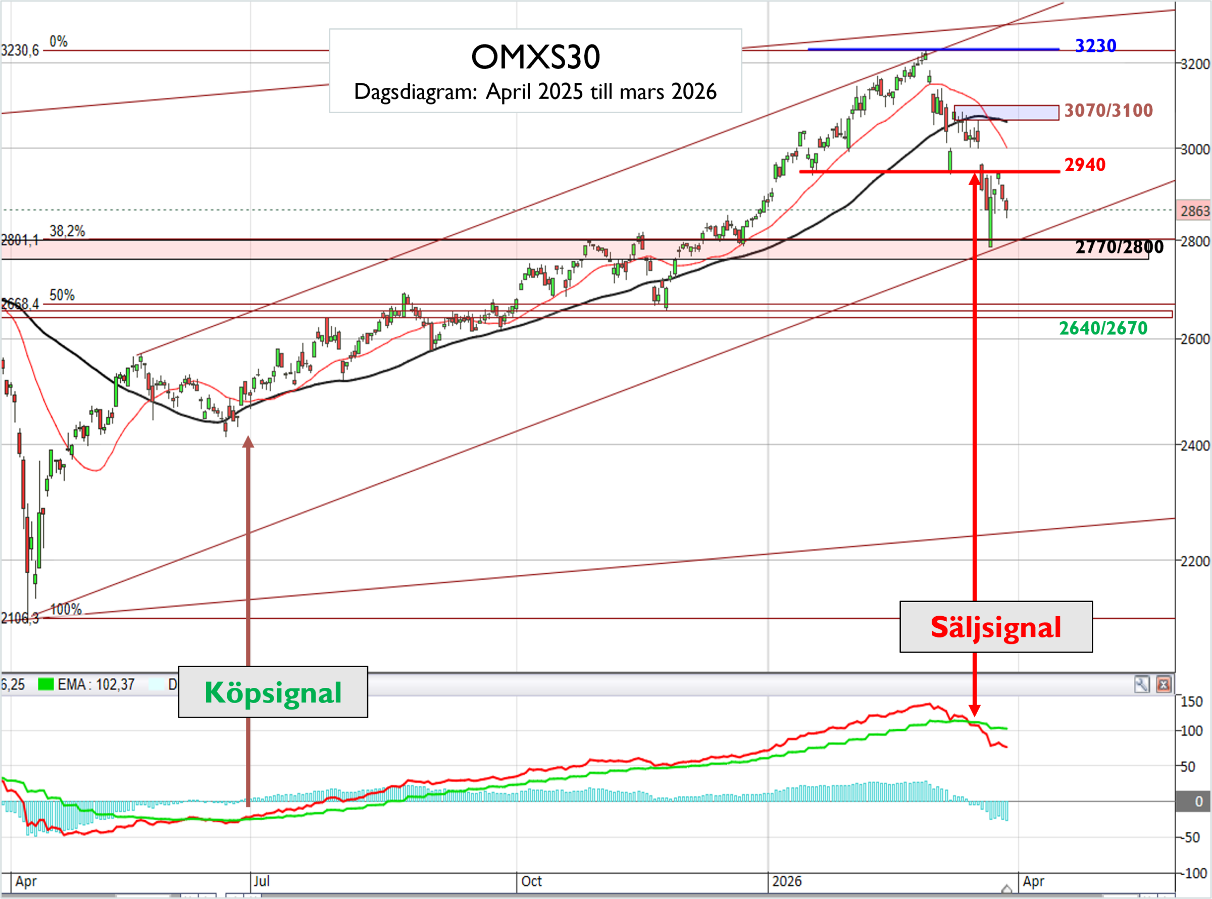 Passeras 2 940 möter nästa motstånd vid 3 070–3 100. På nedsidan bevakar jag måndagens lägsta (2 784) samt naturligtvis stödområdet vid 2 770–2800.