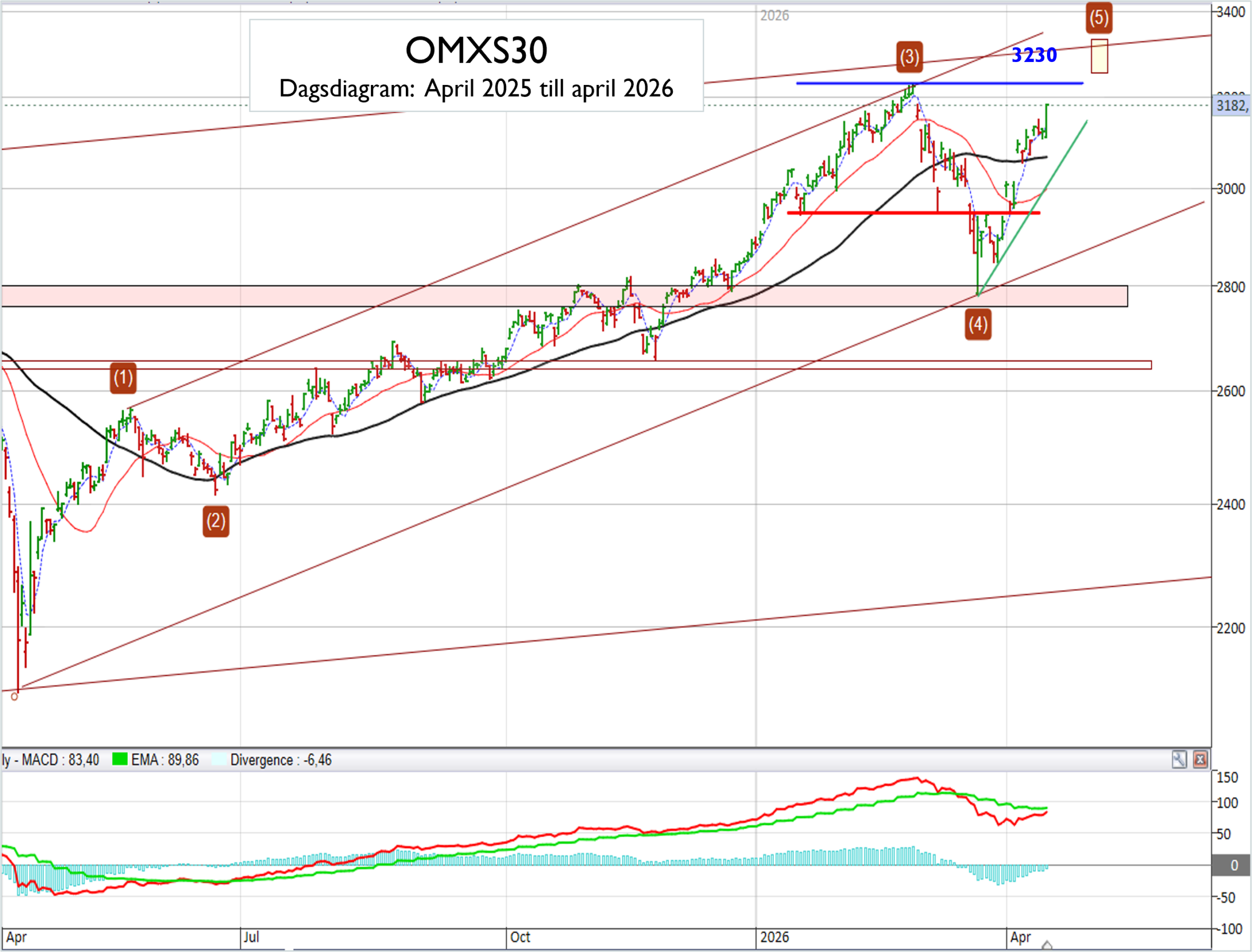När det gäller våganalysen (Elliott wave) navigerar jag efter scenariot att indexet noteras i en våg fem. Om vi köper den tesen borde OMXS30 upp till spannet mellan 3 254 och 3 334 och toppa den 4–8 maj. I diagrammet nedan har jag ritat in en liten ruta högst upp i högra hörnet som illustrerar detta pris- och tidsområde.