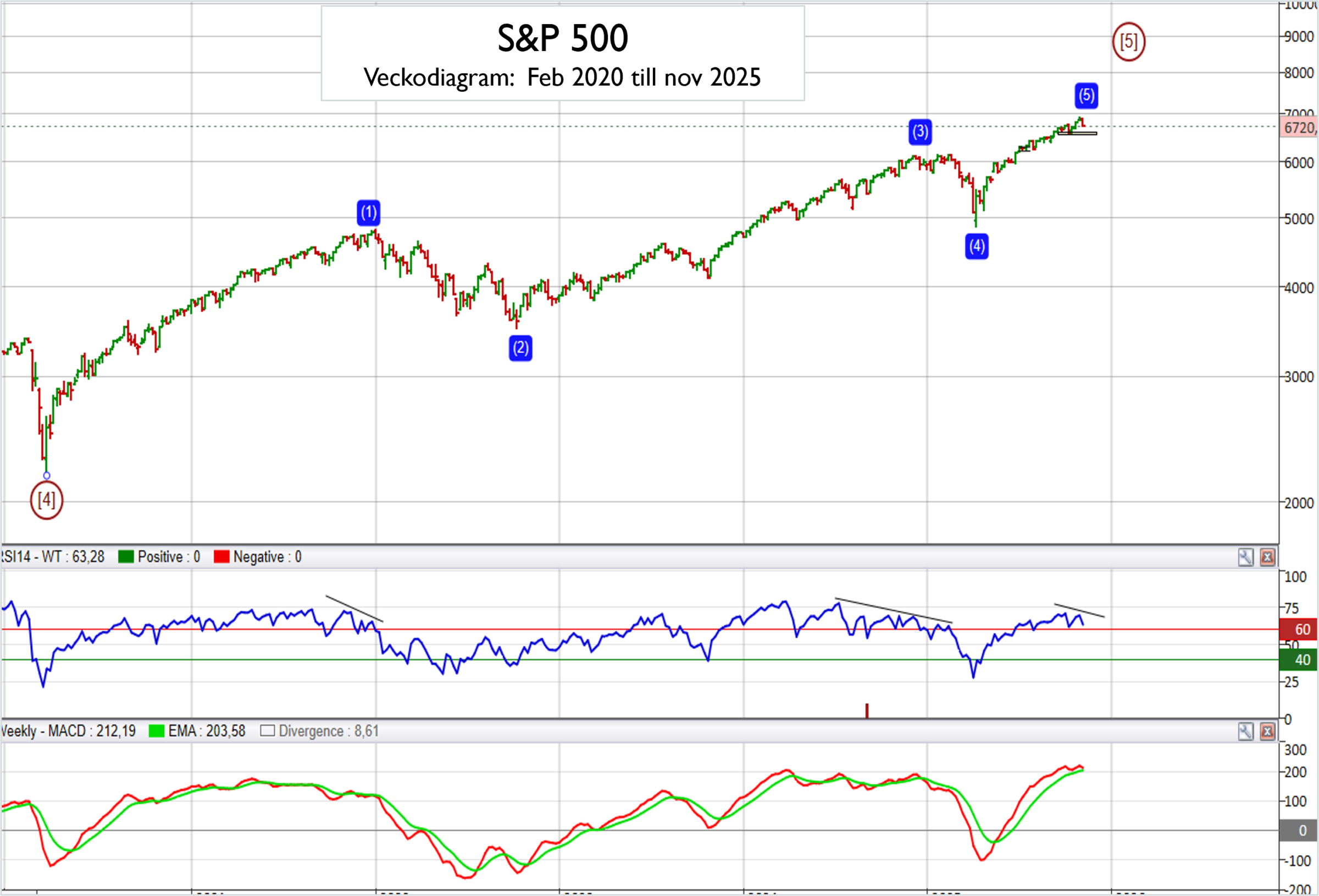 Min utgångspunkt är att USA-börsen står inför en större nedgång, men statistiken talar för att nedgångsfasen bör inledas först under våren nästa år. Rekyler kan naturligtvis komma, men jag tror inte på en större nedgång i det korta perspektivet eftersom vi befinner oss i en extraordinärt stark säsong.
