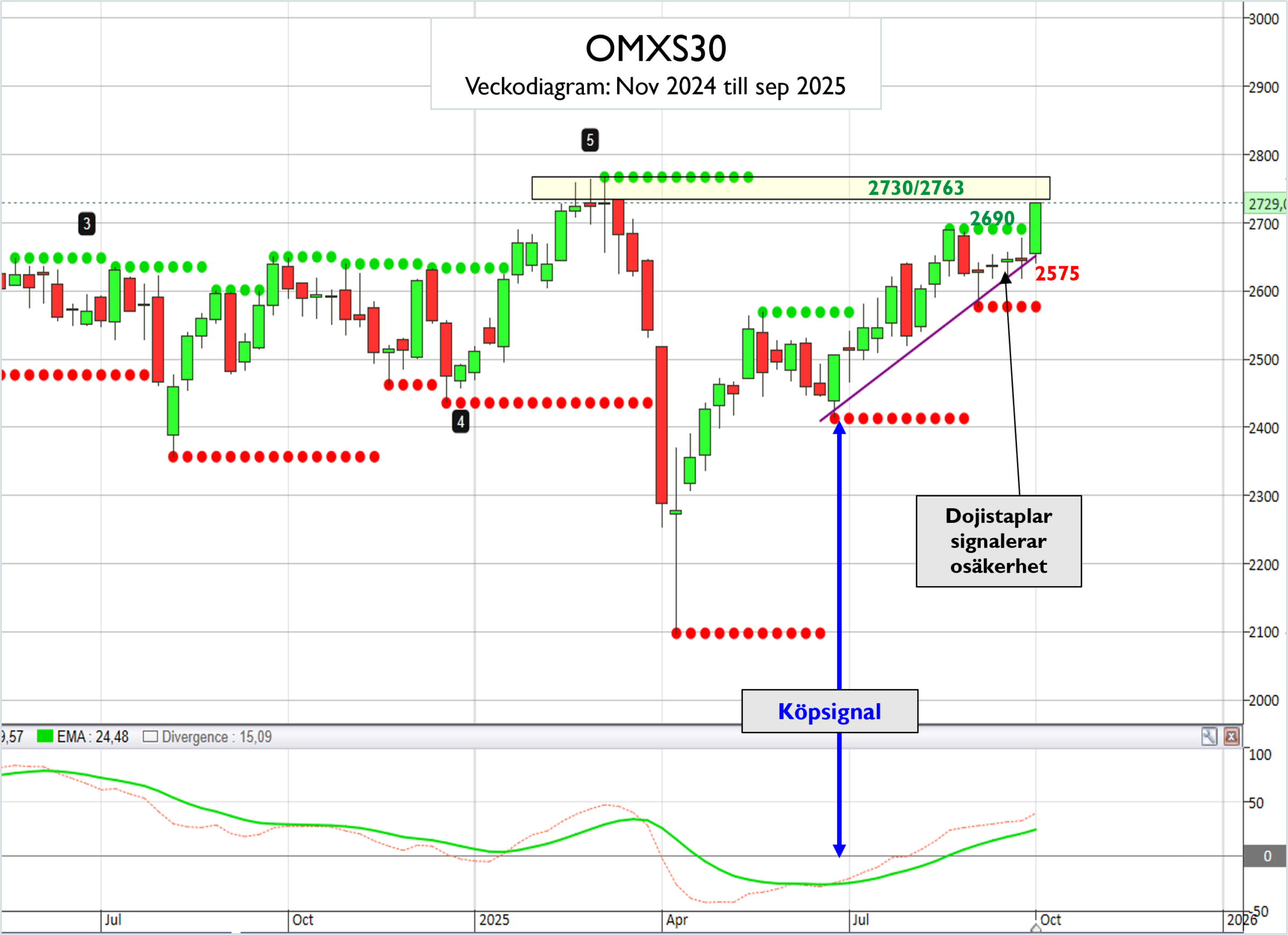 Förra veckan noterade jag att OMXS30-indexet bildat fyra doji-staplar i följd, en signal om aggregerad osäkerhet. Därefter fick vi ett tydligt utbrott över 2 690-motståndet med en stor stapel, vilket innebär en kortsiktig köpsignal i den uppåtgående trend vi sett sedan i juli.