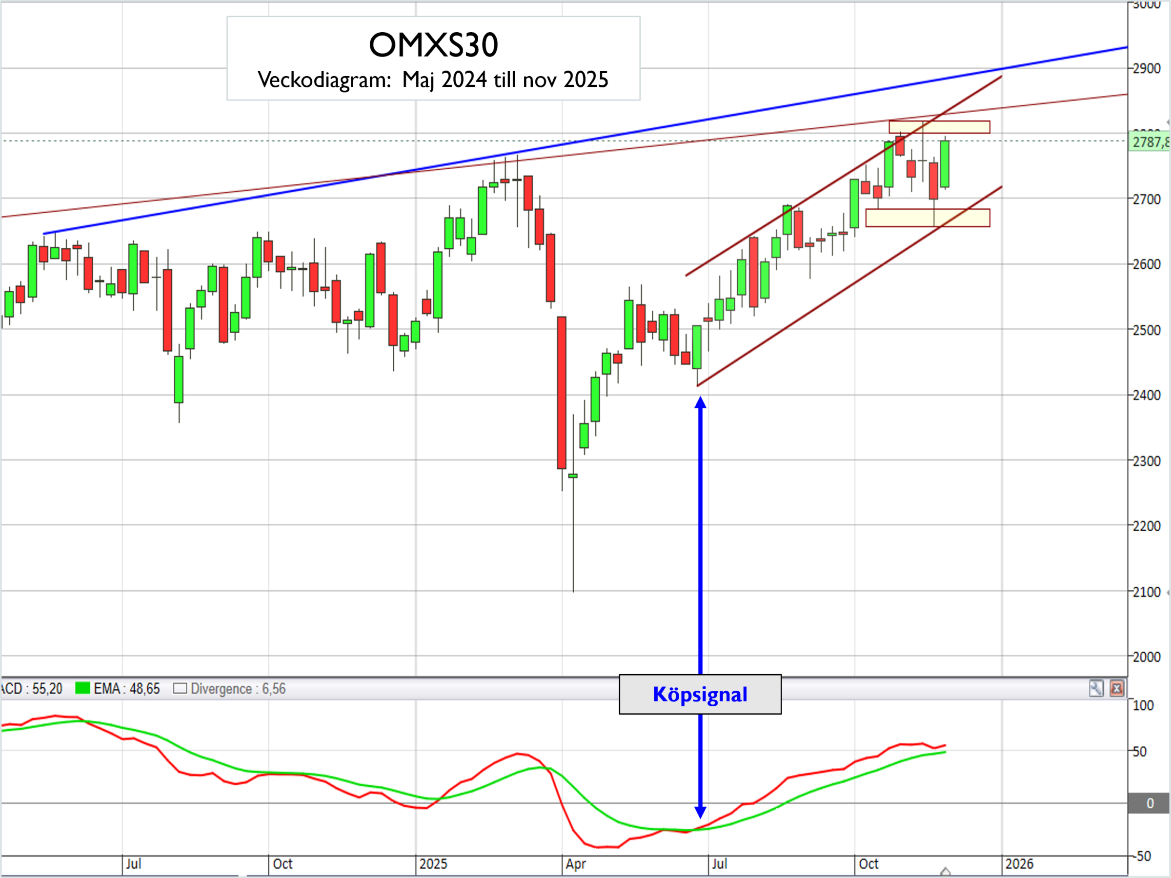 Stockholmsbörsens OMXS30-index befinner sig i en uppåtgående trendkanal och har i den upptrenden bildat en konsolidering mellan stödområdet vid 2 655–2 680 och motståndsområdet vid 2 800–2 820.