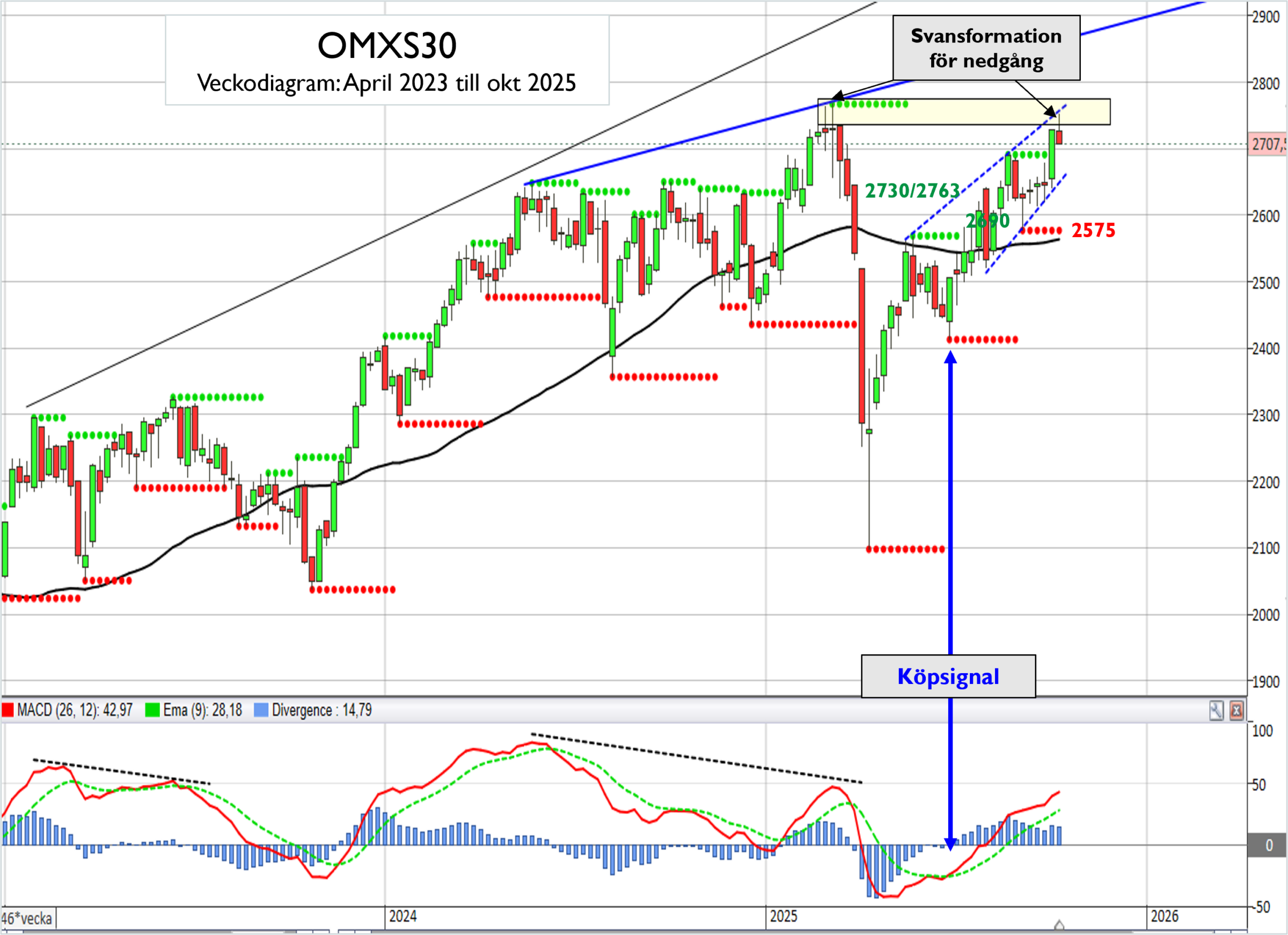 Om indexet i stället bryter igenom motståndsområdet vid 2 730–2 763 är svansformationen överspelad, och då möter nästa tekniska motstånd vid 2 860–2 870.